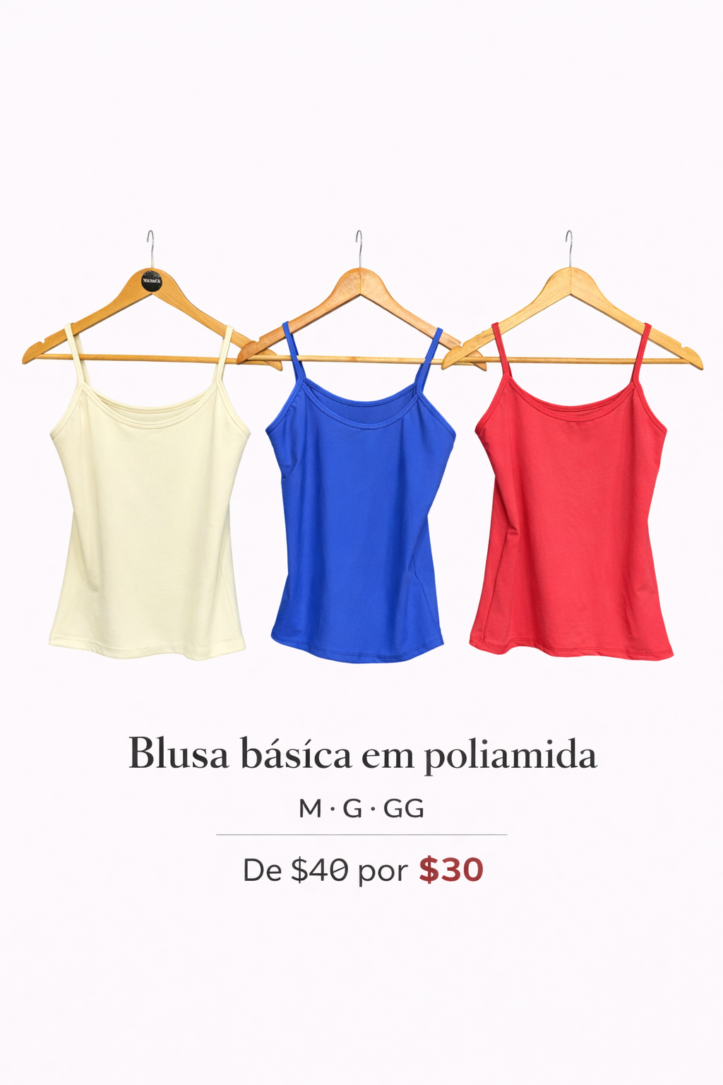 Confeccionada em malha poliamida, possui toque macio, ótima elasticidade e excelente caimento. As alças finas trazem delicadeza e conforto ao vestir.